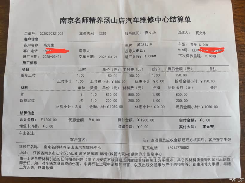 维修价格,工时费150元。用了一个小时。前悬挂下摆臂一套总成850元。四轮定位花了200元。总共维修下来。总费用1200元。