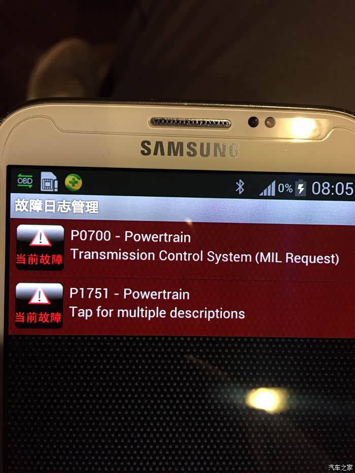 ,无奈只能打开双闪灯怠速龟速开到路边,因赶时间直接扔在路边打的走了。回来后再次发动,结果还是一样,最后断开电瓶5分钟,再接上,临时解决了问题,到家后用OBD检查了一下,如图的信息,应该是说变速箱的问题,心都碎了