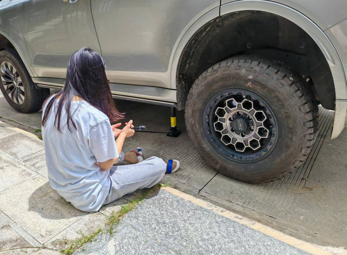 确定好路线,老婆最兴奋。 非常主动的提出要练习换备胎,我随口一说“那你把4条AT胎都换上吧”,结果她当真了。