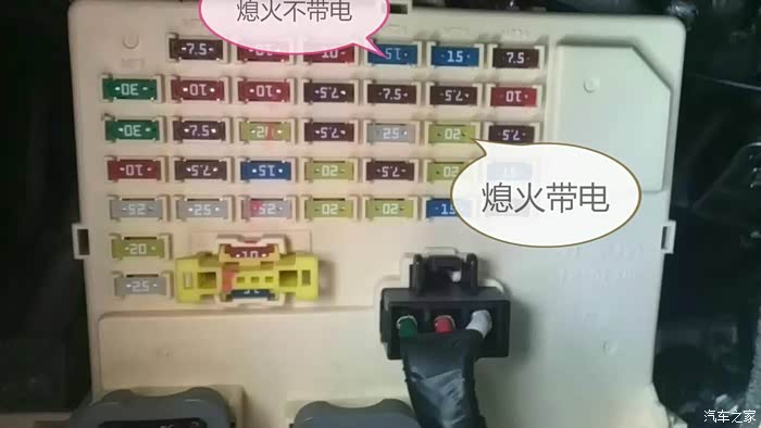 重要提示:从保险片取电有两种方式,一种是熄火不断电。这种取电方式的好处是车子熄火后为记录仪持续供电,其移动侦测拍照等功能可以工作。缺点是持续用电造成电瓶亏电,损害电瓶;另一种是熄火断电,好处是不损害电瓶,缺点是不能在熄火后为记录仪持续供电,影响更多功能发挥。索八车型接点烟器保险片便熄火断电。在这里最好咨询一下专业维修人员,我经咨询当地现代4S师傅,他传来了下面这张图,并在图中标明“熄火不带电”和“熄火带电”保险片位置。图中“熄火不带电”保险片的右边那个蓝色15的保险片即是点烟器保险片。基于四方面原因,我选择了熄火不带电保险片取电:一是我在OBD上接上了一个车挣盒子,熄火后用电,如果再接熄火带电的保险片,电瓶负担过重。二是我的车子停车后放入车库,记录仪的移动侦测功能几乎没用。三是我选的这款记录仪本身带有电池,可持在熄火用自带电池续工作较长时间。四是虽然点烟器熄火断电,但如果偶尔使用点烟器时记录仪也在工作,是否会电流过大造成保险片自毁呢?