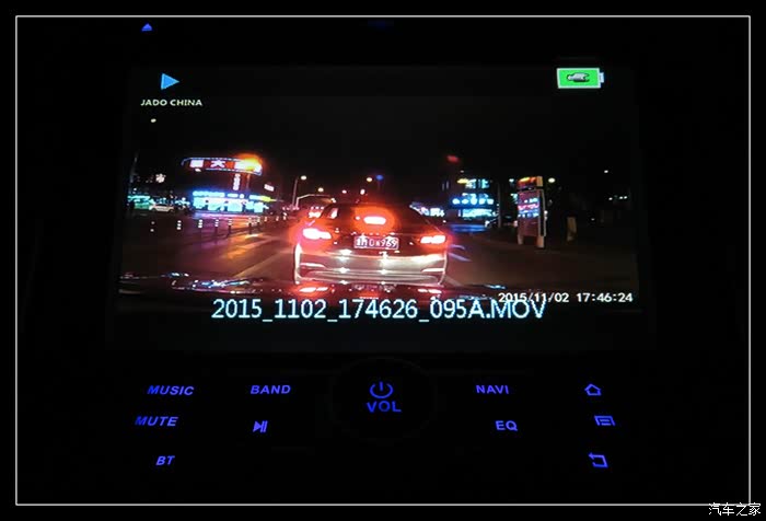 然后通电、设置记录仪TV输出,在导航上选择点击AUX IN图标(安卓系统的一个应用),这样记录仪上的画面便输入在导航显示。下图是点选记录仪的一条记录回放后在导航屏幕上显示出来,图像更大更清楚