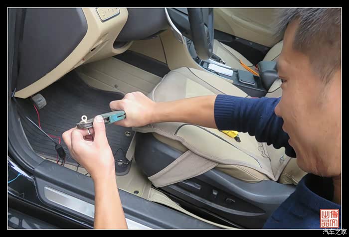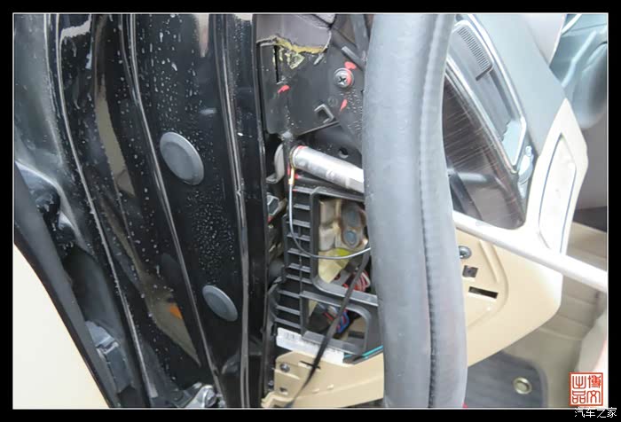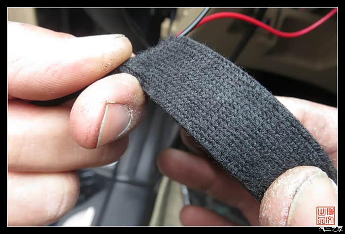 下面的工作便是将长出的线路用绒布胶带緾好,置入保险盒空位,导航、面板、中控台侧板、门框胶条复位▼