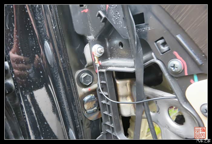 降压线黑线(负极)要搭铁,接上了一个搭铁垫片(其实这一步先于穿线开始了)▼