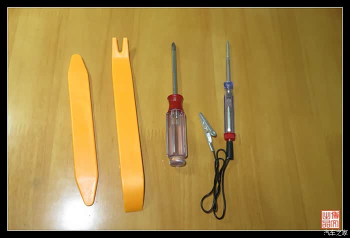 下图从左至右分别为:两个撬板,布线使用;十字螺丝刀,拆装导航链接视频线使用;检电笔,检测保险电路使用。这些简单工具是折腾达人的必备工具,之前网购其它改装用品时商家赠送的▼