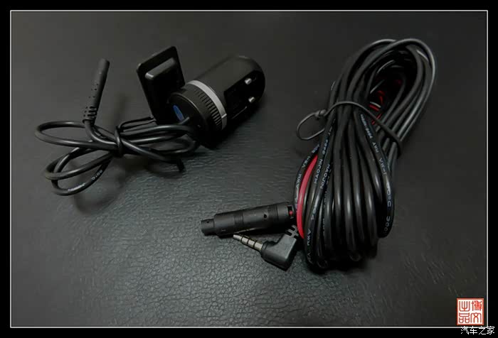 后摄像头与导线,这个后摄像头的特点是自带电源线,接到倒车灯电源上后,后摄像头便可同时做记录仪后摄像头和倒车摄像头使用▲