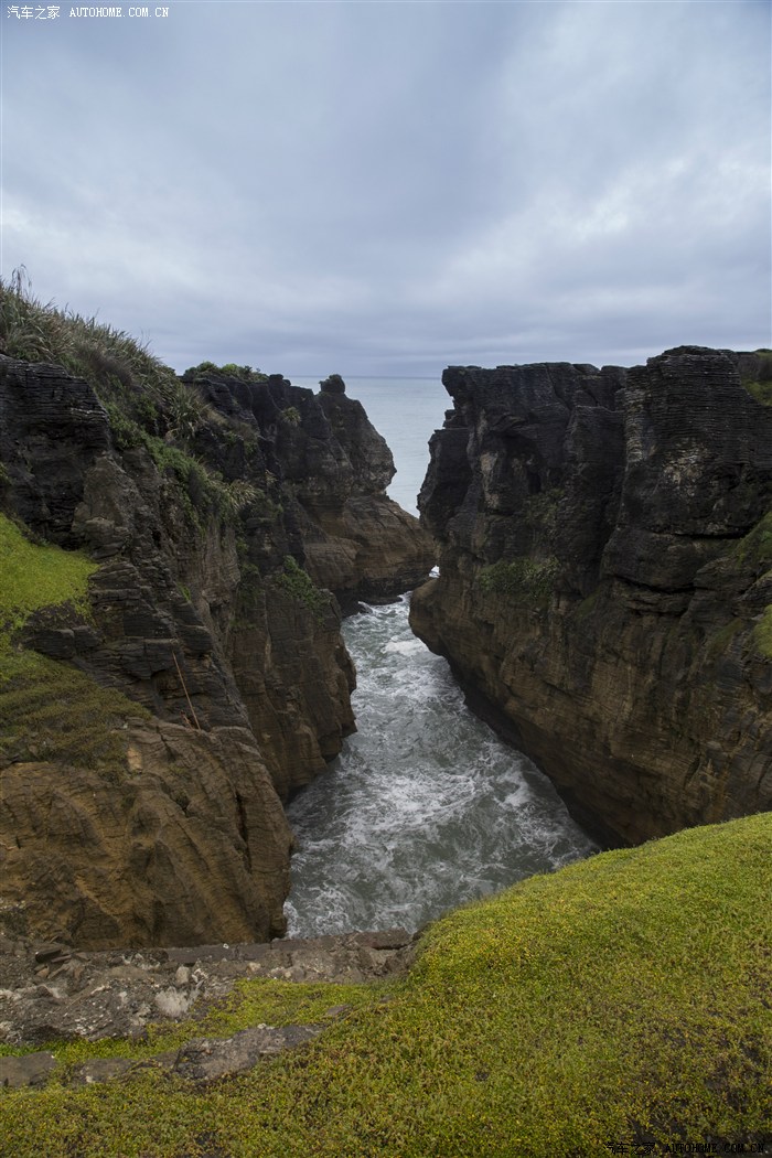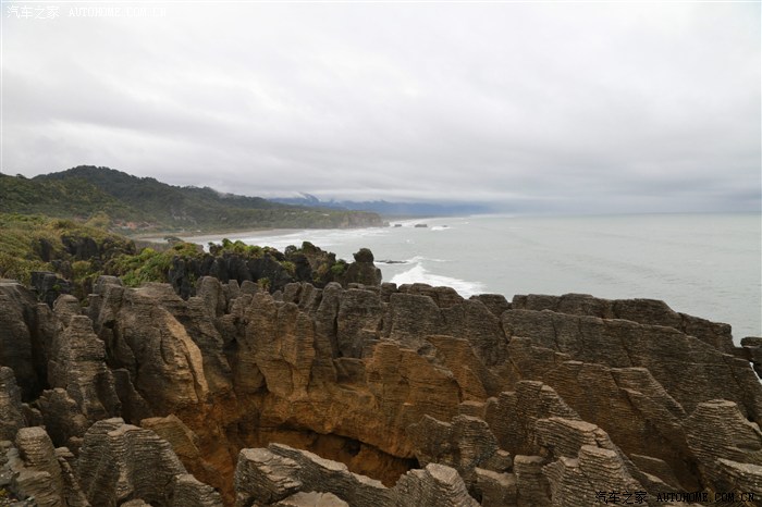 自格里茅斯出发至哈斯特(地图1--地图2)先去看了普纳凯基的煎饼岩,所谓煎饼岩是因为岩石经过海水的不断侵蚀形成层状。很像煎饼故名煎饼岩