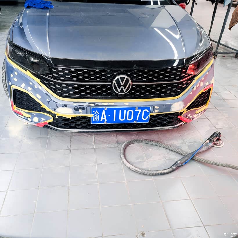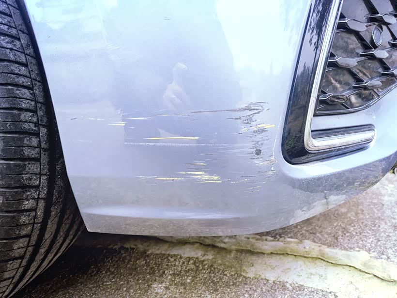 修理师傅对前杠进行了仔细检查评估,确定两处损伤都只是表面漆面划伤,没有出现凹陷变形,也不需要钣金修复,只需要对受损部位进行打磨找平、重新喷漆抛光即可恢复原样。