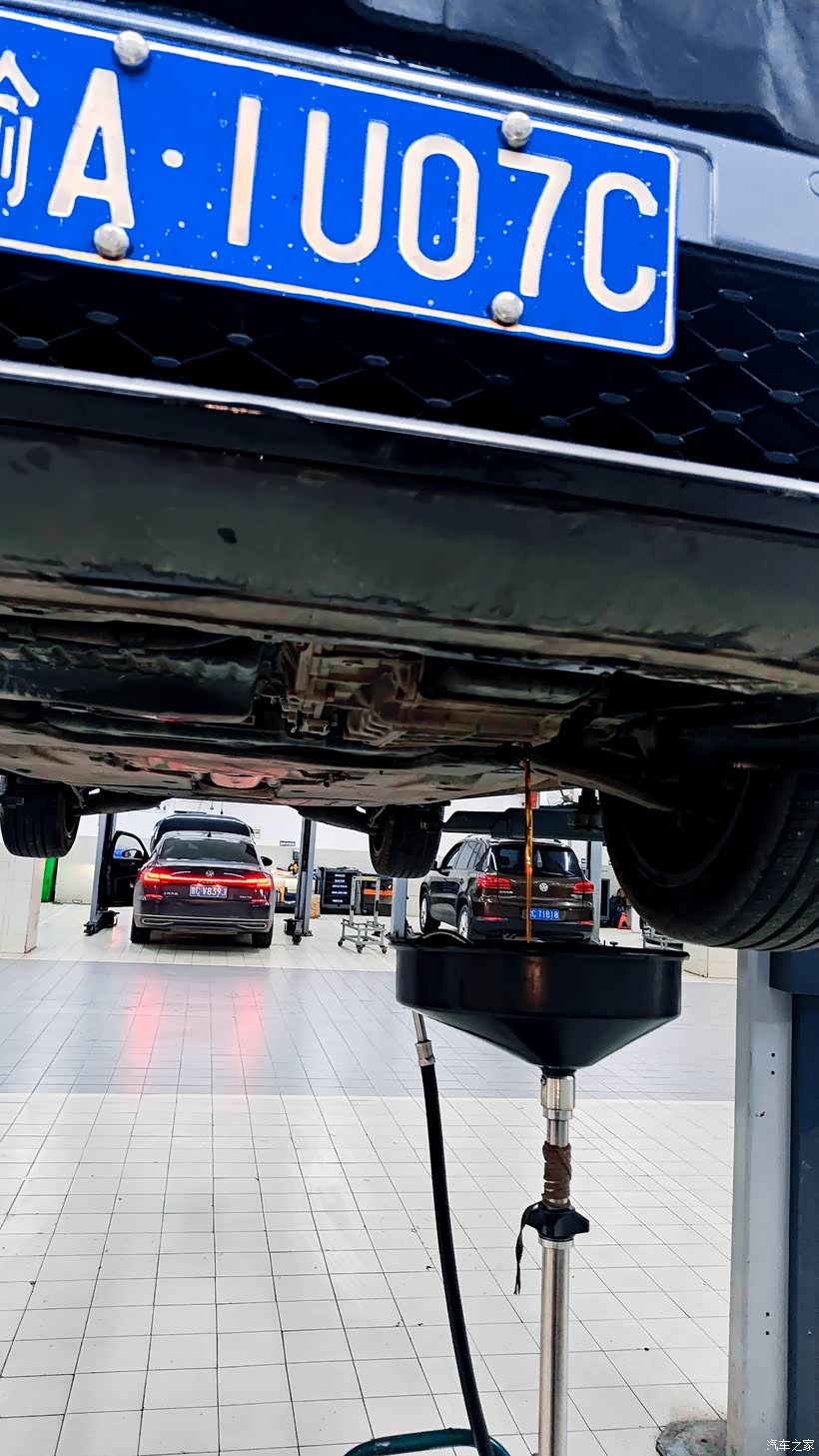 提前跟4S店确定好保养项目和时间,我趁着周末又和爱车踏上了保养之路。到店后,没一会儿,车子就被送上了举升机。维修师傅先把旧的变速箱油放出来,颜色确实已经很深了。然后,用重力换油的方式更换了上汽大众原厂双离合变速箱油。流程很规范:放油、更换滤芯、密封、加注新油,最后再检查液位、路试调试。