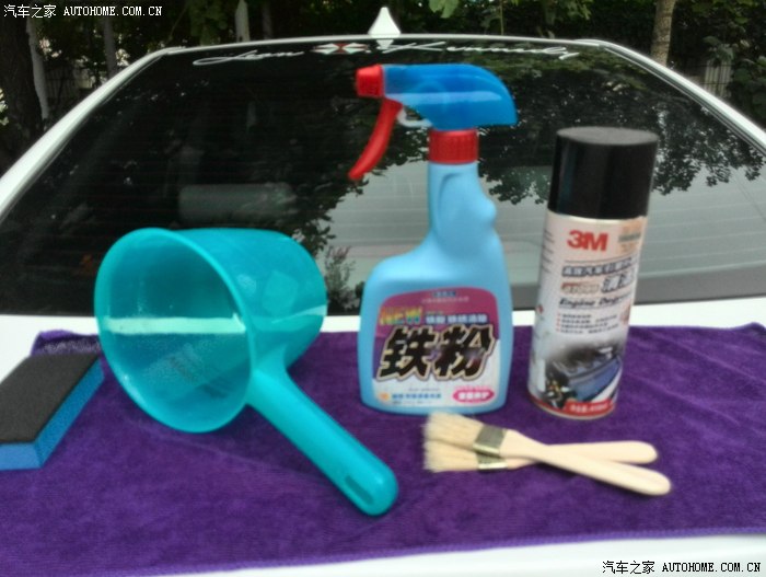 (我大清洗的时候用洗车机,小清洗就用水桶接水,用这个水舀冲一下,然后擦干净。右面的液体和下面的小刷子是处理我发动机舱的卫生的,机舱收拾完的照片让我弄丢了,总之很XXXX的)