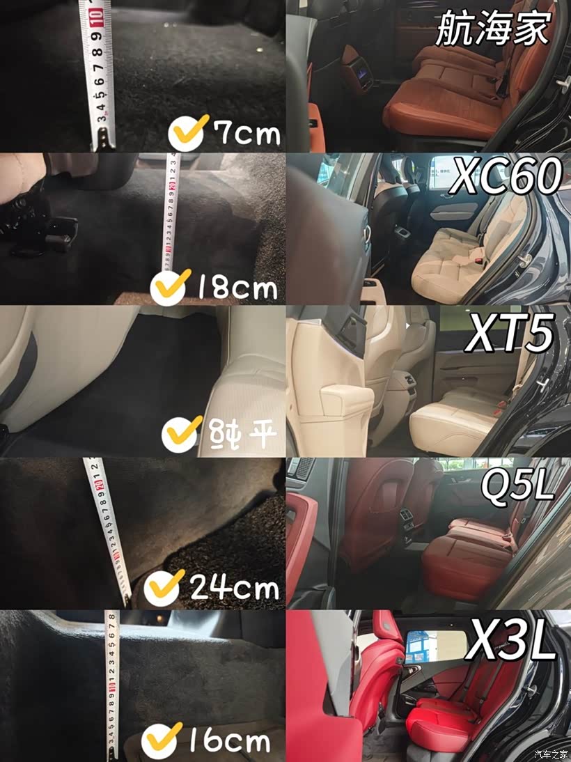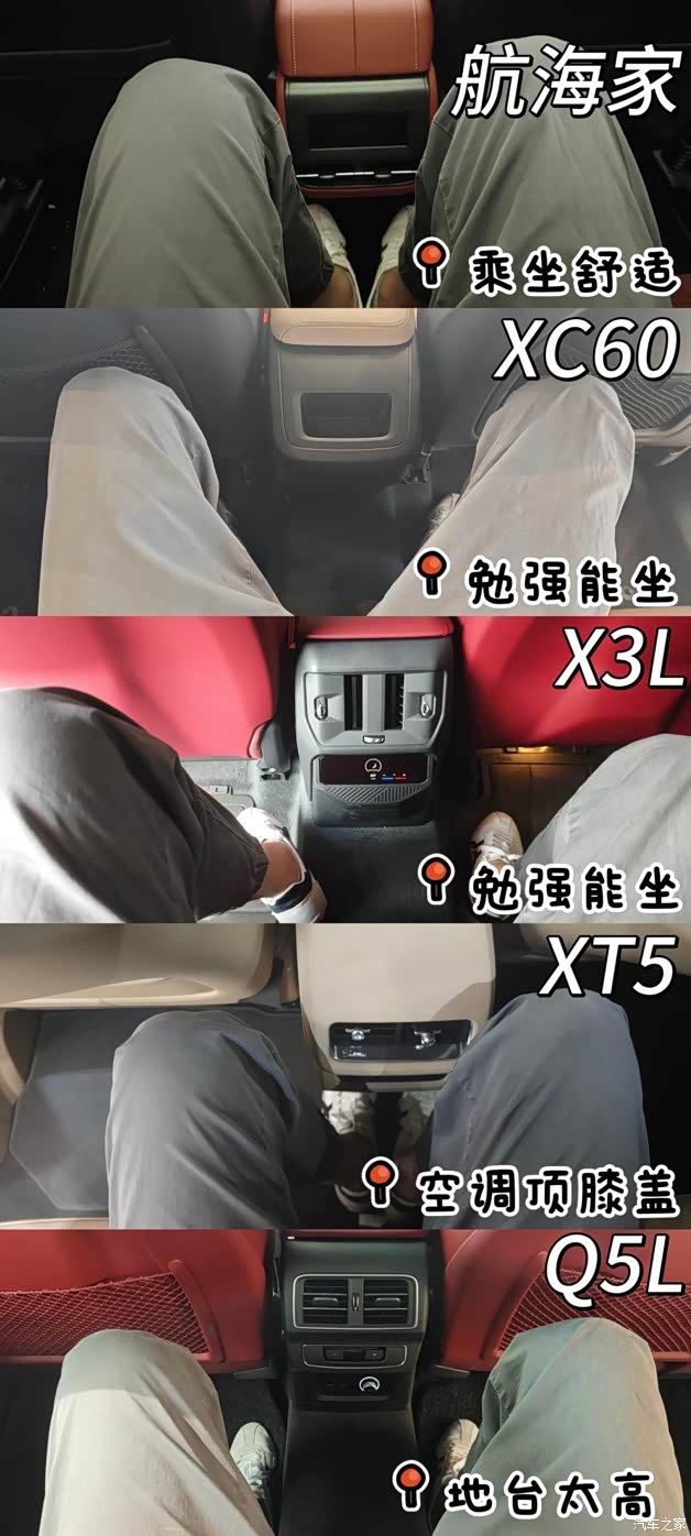 中间地台高度也很关键,毕竟有有时候后排带上父母满员乘坐。航海家地台凸起也就 7cm 左右,踩在上面能稳稳当当的,拍的图里能看见脚平放在地台上。XC60 地台高18cm,中间位置得踮着脚;XT5 也几乎纯平,但中间的空调出门口会很突出,成人坐中间脚都得岔开; Q5L最夸张,地台高度差不多24cm,双脚踩在地台上都显高,只能双脚分开坐;X3L凸起 16cm,中间乘客同样也是要双脚分开,中间位置坐姿不太舒服。