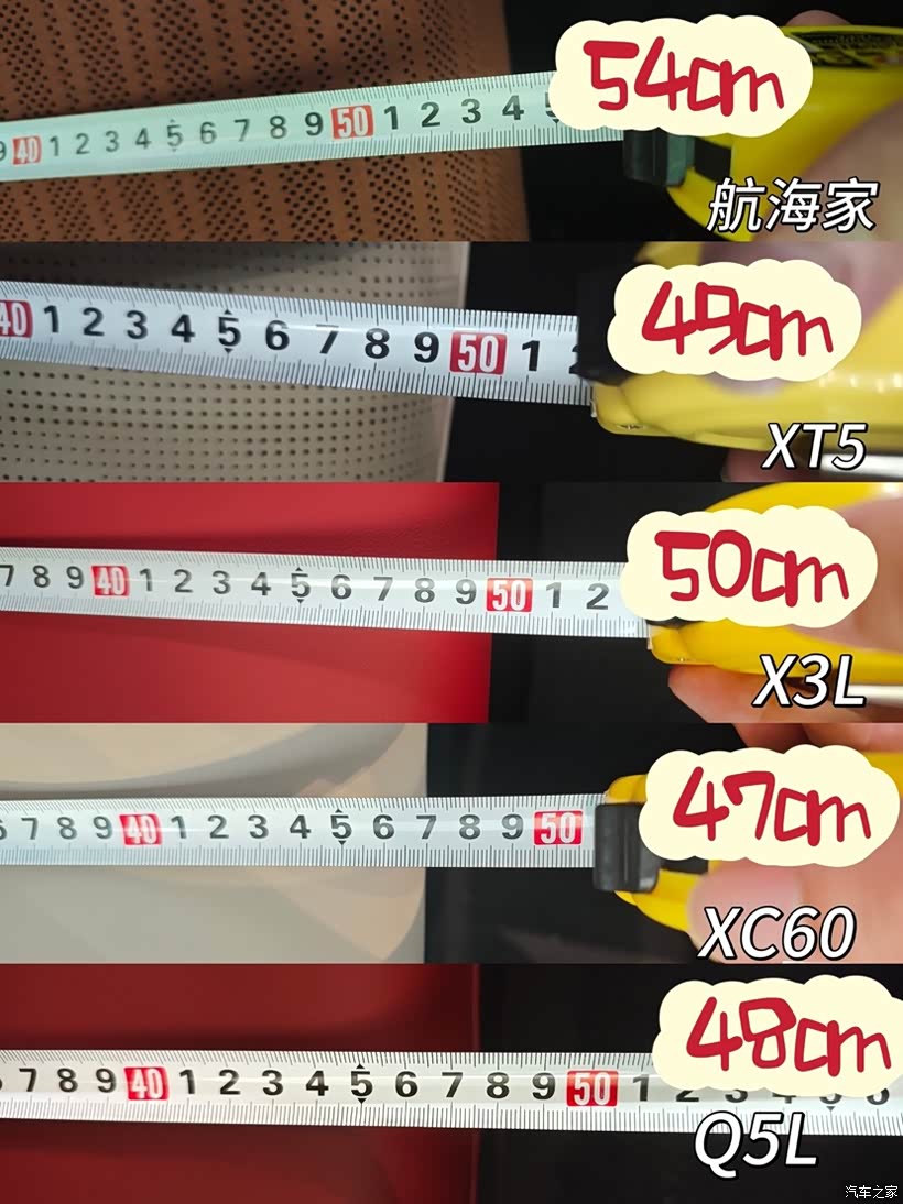 这么比下来,后排能让一家五口都坐得舒展的,也就只有航海家了,XC60和 X3L勉强能坐,但不舒服,XT5和 Q5L 直接 pass。