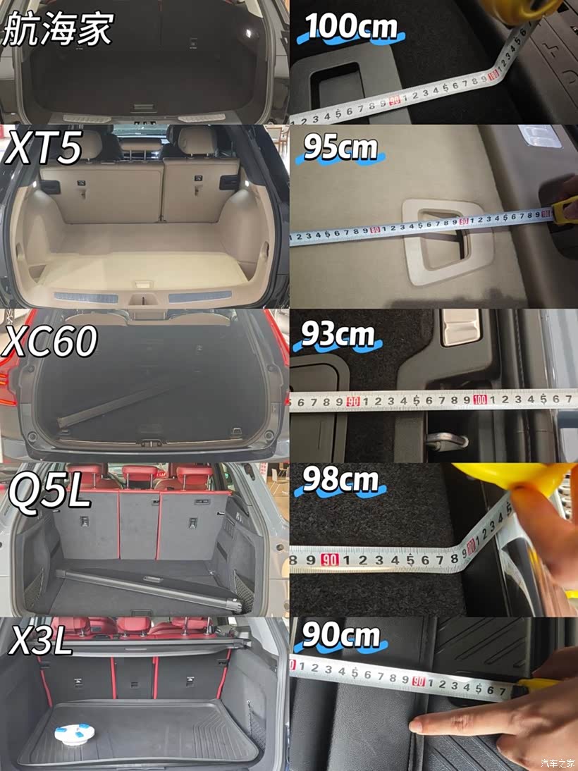 家用车后备箱得能装 ,带了把卷尺量了下,航海家的后备箱尺寸明显会大一些。从之家上看的数据,也印证了我结论。尾门是电动开启,女生的话不用踮脚就能关上,XT5 虽然也还行,但是其实整车的空间都是被紧巴巴压缩的,后备箱的空间深度中等水平。XC60 空间也比较一般,后备箱按照实际装载空间看,去掉锁扣位置,纵深93cm左右,而且后备箱开口高,搬行李箱会麻烦点踮着脚。Q5L 后备箱纵深98cm左右,门槛一样较高,搬大行李箱得抬一下。X3L 后备箱纵深90cm左右,属于这个级别中等水平吧,而且尾部的造型不是很能接受,不算挑刺,大家觉得呢?综合体验下来,对于我这种家用需求的来说,后备箱不仅要装得多,还得方便老人小孩操作,从这点看,航海家比其他几款合适。