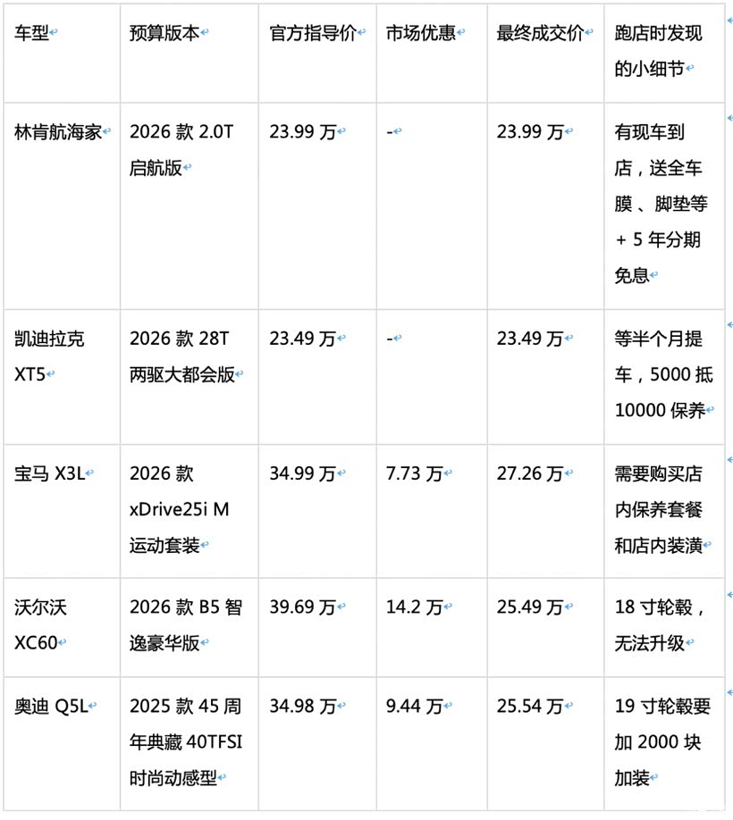 二十多万预算想挑辆豪华 SUV,本来以为这个价位只能碰着入门款的 “边角料”,结果刷之家的时候刷到林肯航海家新出的启航版 ,现在官方价格 23.99 万,去 4S 店看了看车,和销售聊了聊,还有其他综合优惠可谈,算下来 27 万就能落地,这价格还是可以的。但买家用车不能光看一款,毕竟要装下一家子,还得兼顾实用和省心,兜兜转转也通盘考虑和看了凯迪拉克 XT5、宝马 X3L、沃尔沃 XC60 和奥迪 Q5L 这几款热门车,这近一个月选个车可是把我累惨了,周末去各家店看,实际体验了下展车,现在把选车的真实心得跟大家唠唠。
