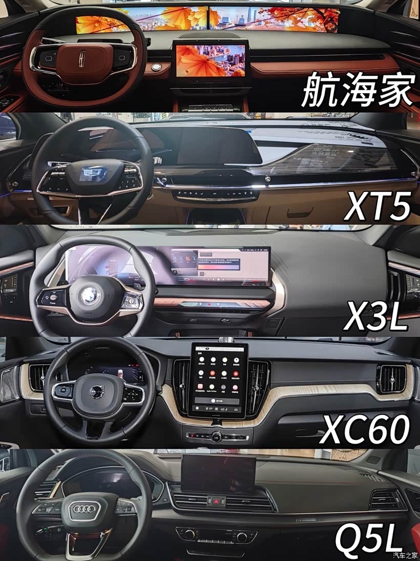 车机系统也得好用,不然开车调功能太分心。航海家环抱屏是够吸睛的,车机流程度也够可以,说 “打开空调 24 度” 立马响应。XT5 是33寸的屏,视觉也不错,就是我看网上说屏幕容易黑屏,有点担心,而且屏幕尺寸是没有航海家大的;X3L是14.9英寸的,视觉上一般,尺寸上属于中等水平。XC60 是 11.2 英寸屏,操作和语音速度一般;Q5L 10.1英寸,五个车里最小的,而且奥迪的智能水平很一般用着不顺畅。
