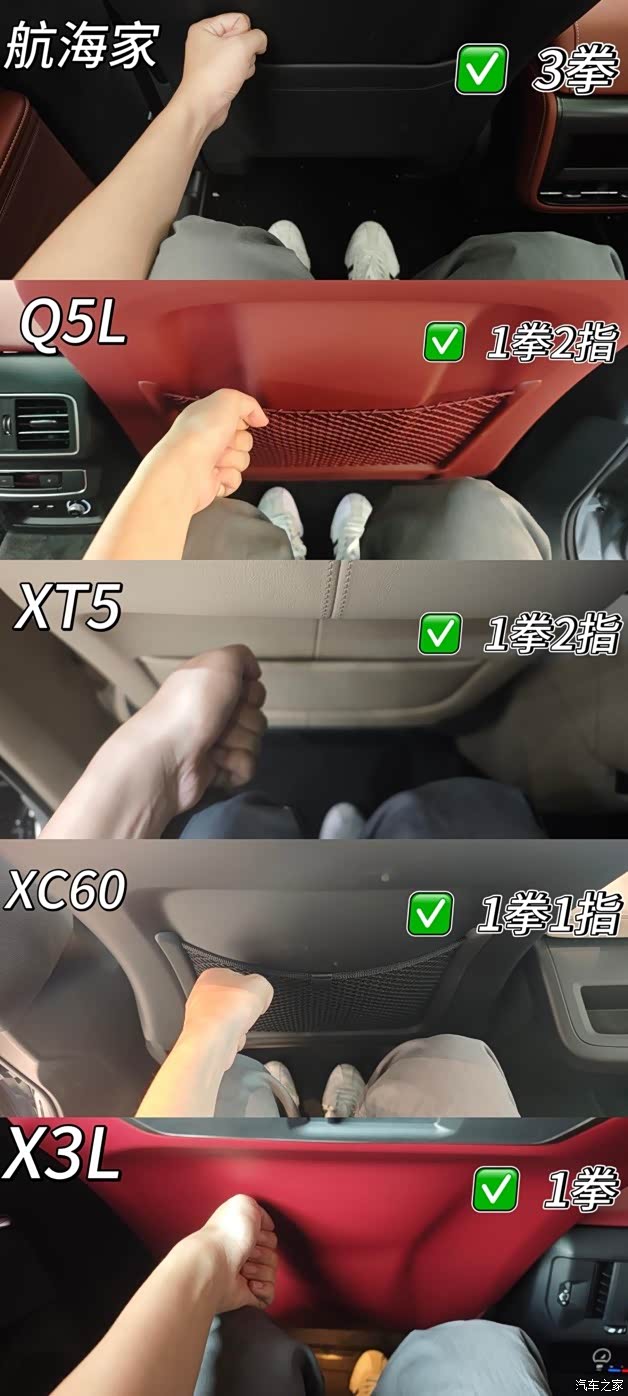 先说最影响二拍乘坐的膝盖距离,航海家我坐进去,膝盖离前排能有3拳左右,这个空间跷二郎腿也足够。Q5L和XT5差不太多,基本在1拳2指左右,这两款车型的前排靠背内凹比较严重,所以膝盖空间基本都是“偷”出来的。XC60保持舒服坐姿之后一拳多一点点,差不多还能塞进一指。X3L刚好一拳,其实X3L看着空间挺大,前排座椅内凹弧度也很明显,不过当前后排都调整好舒服坐姿之后,后排空间就没那么优秀了,如果老婆在后排想翘二郎腿估计有点困难,但X3L的坐垫是5款车中最软的。