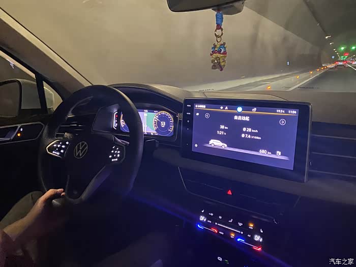 路经隧道,爱车途观L的灯光效果还是很不错的,不论氛围灯和显示屏都很清晰。