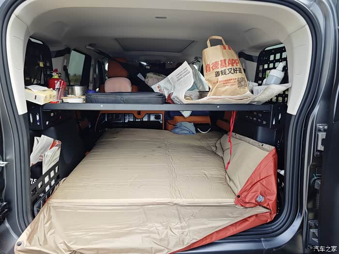 座椅拿走然后再用储物箱搭平,这样就能得到2米的大床了。这几次我们露营过夜,一家三口睡着,一点问题没有。车友们要是在车上过夜的话记得一定要开一点窗户通风。