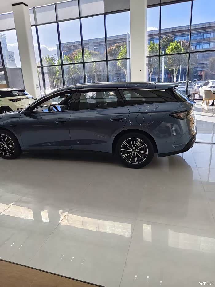 一进店就瞅见展车是那种低饱和的灰蓝色,阳光下泛着细闪,比图片里耐看十倍。车头那排点阵式小灯组特精致,凑近看才发现是能亮的,朋友直接掏出手机拍半天,说 “这前脸开出去绝对不撞款”。车身侧面是真 “瓦罐” 那味儿,溜背线条不突兀,车顶行李架 + 后扰流板一搭,运动感直接拉满,我摸了下车身漆面,手感比旁边的轿车款更细腻,销售说这是新款的哑光金属漆,难怪看着高级。
