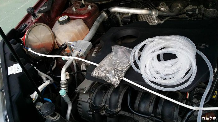右大灯安定器就固定在灭火器后面,关引擎盖,上面还有很大余量。接下来进行改装线路,氙气大灯线路和大灯总成线路全部使用阻燃管包裹。