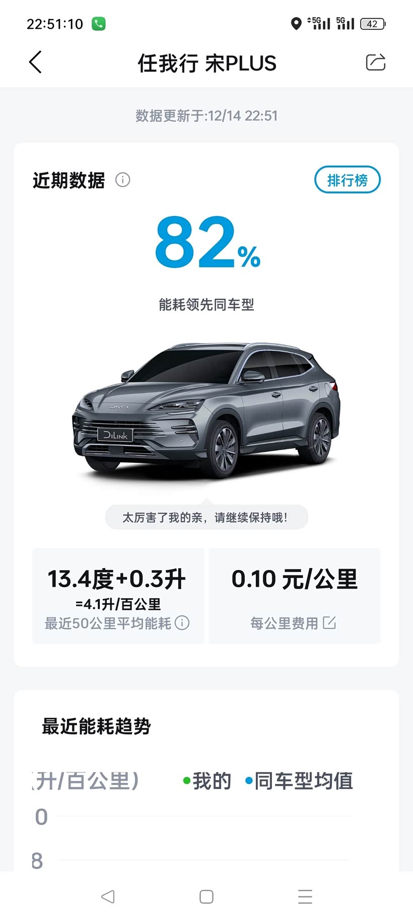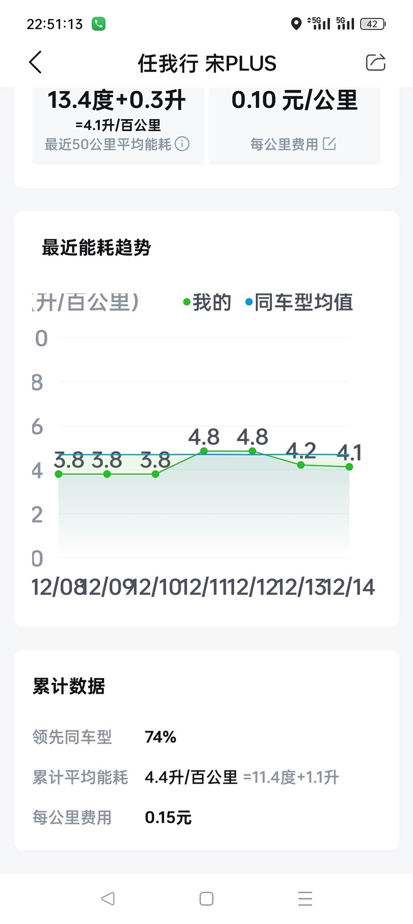 比亚迪宋PLUS DM-i 旗舰型作为一款混合动力车型,其油耗表现非常满意。截至12月14日,我的宋Plus总里程是5575公里。第2个月只开到1770公里,因为比亚迪的3电质保每年限制是3万公里,为了不脱保,所以第2个月驾驶里程断崖式下降,从3800公里降到1800公里。