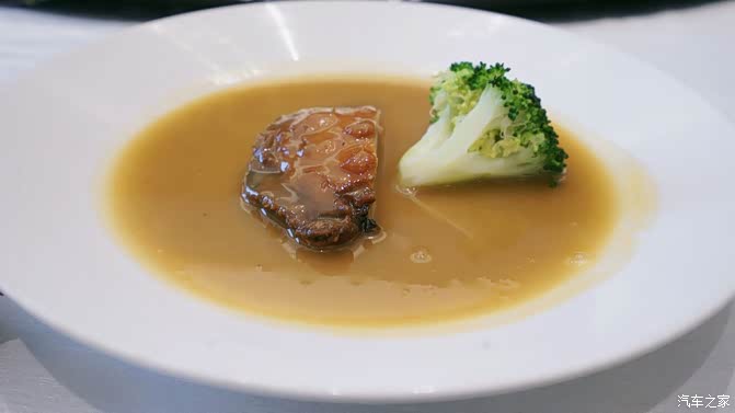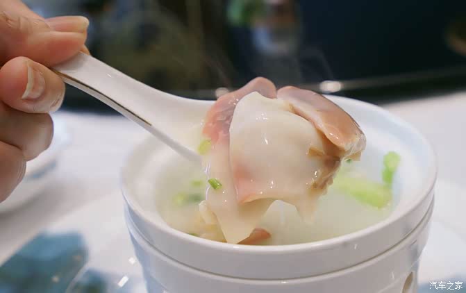 古法鲍鱼皇半只、采用1斤的澳洲鲍鱼,十多种规定牌子的食材一起熬制一天吊汤头,加入泡发好的鲍鱼一起煨上数十小时甚至好几天,最后舍弃所有配料,仅取汤汁浇于煨至软糯的鲍鱼上,至此一道足以收买任何老饕的古法鲍鱼才完成。肉质细嫩、鲜而不腻、清而味浓。难怪苏东坡写诗盛赞鲍鱼“一枚何啻千金直”。给予满分。
