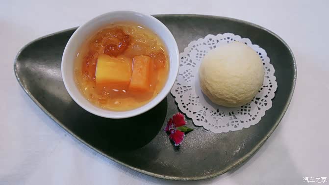 流沙包、桃胶、流沙包的外皮脆脆,内陷软糯,味道香甜,扑鼻而来的还有浓烈的麦香,如金沙般的馅料还是欠缺一点。琥珀般美丽的滋补养颜食材,味淡,却有一点清香,口感似果冻,鲜嫩滑爽,故而和“甜味”的流沙包最搭。