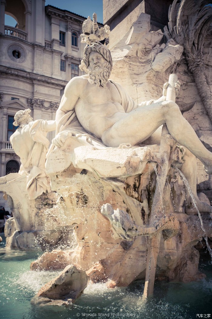 《四河喷泉》是贝尼尼为罗马篷·腓力教皇的宫殿设计的喷水池。“四河”指人类征服的四条大河:多瑙河(Danube)、恒河(Ganges)、尼罗河(Nile)、里约·德·拉·普拉达河(Rio de la Plata),同时这四条河流又代表了人类文明的四块大陆:多瑙河表示欧洲,恒河表示亚洲,尼罗河表示非洲,里约·德·拉·普拉达河表示美洲。在这里,作者用四个大理石人体雕像象征了四条河流,中间是假山和一个埃及式的方形花岗岩尖塔,寓意着天主教在全世界的胜利。雕塑的下方环绕着巨大的水池,水池中央用石灰岩堆砌成假山,喷泉的出口都设置在其中。在假山上,四个老人朝向四个方向坐成不同的姿态。