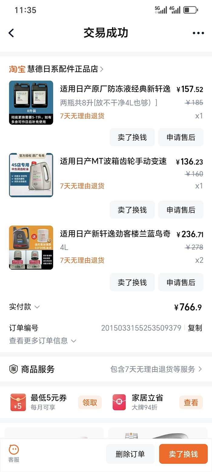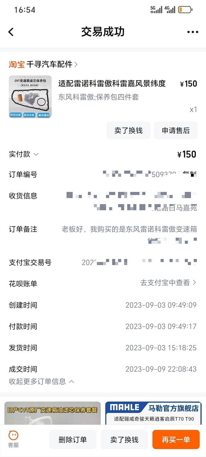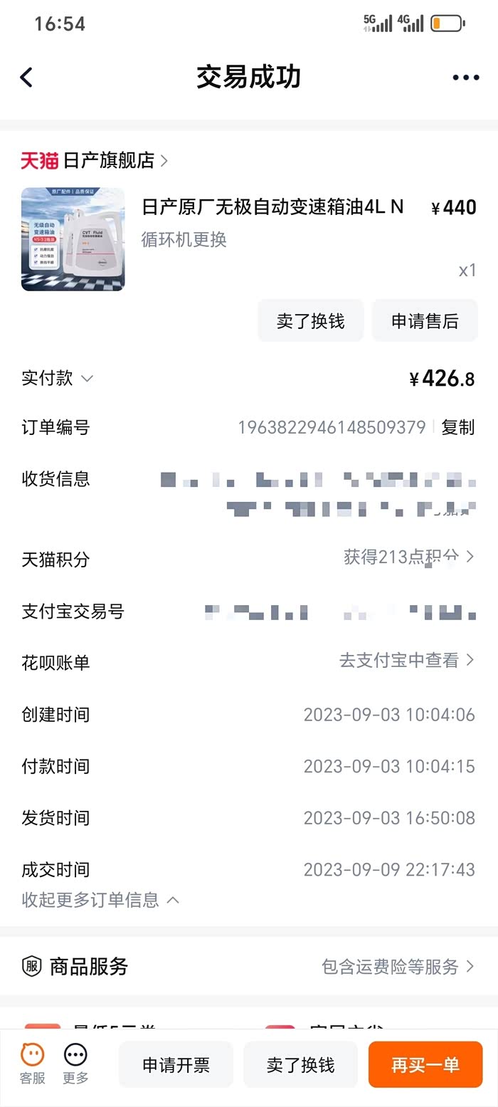 23年保养时,里程6万多公里,朋友建议更换变速箱油,采用重力更换,拆底壳换里外2个滤芯,为了把老油换得干净一些,先用一桶油循环后放掉,再换第二桶油;2桶油426,加上变速箱油滤、壳垫150,手工费220,共用796元。