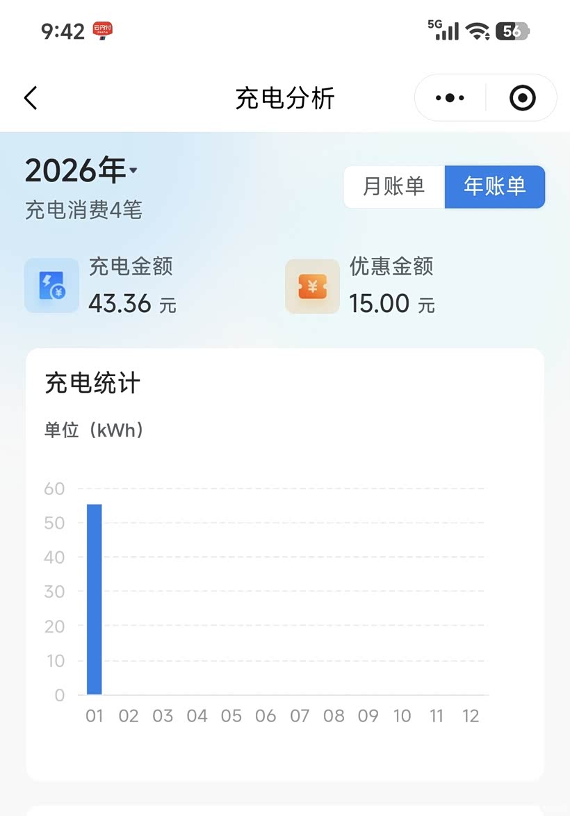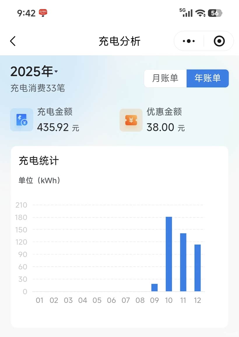 先算电费:车辆CLTC纯电续航160km,冬季实测能跑140km左右(我是在广西的,冬天温度基本都是8℃以上),在单位的充电桩,充电是1元一度电左右,电池容量19.7度,满电仅需19.7元,基本够一周通勤。这5700公里里,纯电跑了4883公里,总电费479元,折合纯电每公里成本仅0.09元,一杯奶茶钱能跑一周,比坐公交还划算。