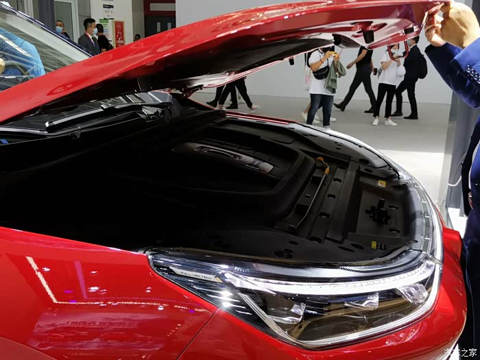 前脸非常具有辨识度,采用的是电动车常用的封闭式格栅结构设计,科技感十足,在牌照下面的蜂窝格栅是他的进风口,前大灯是LED的量子律动大灯,因为没办法开启,所以感受不到律动的效果。
