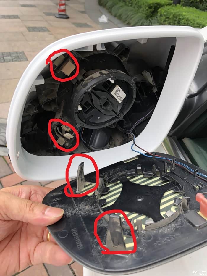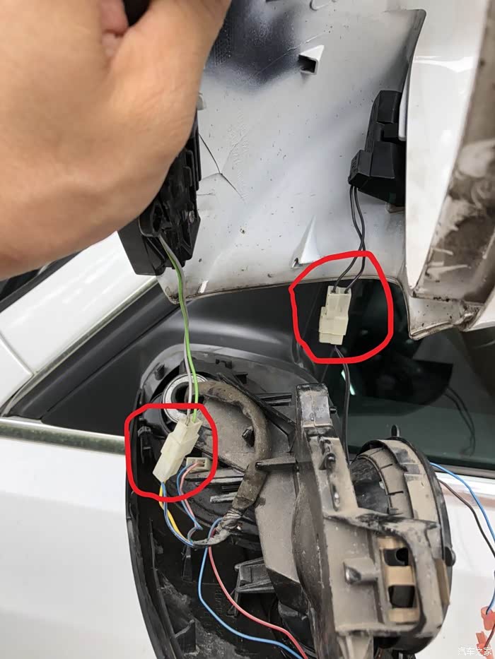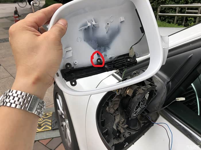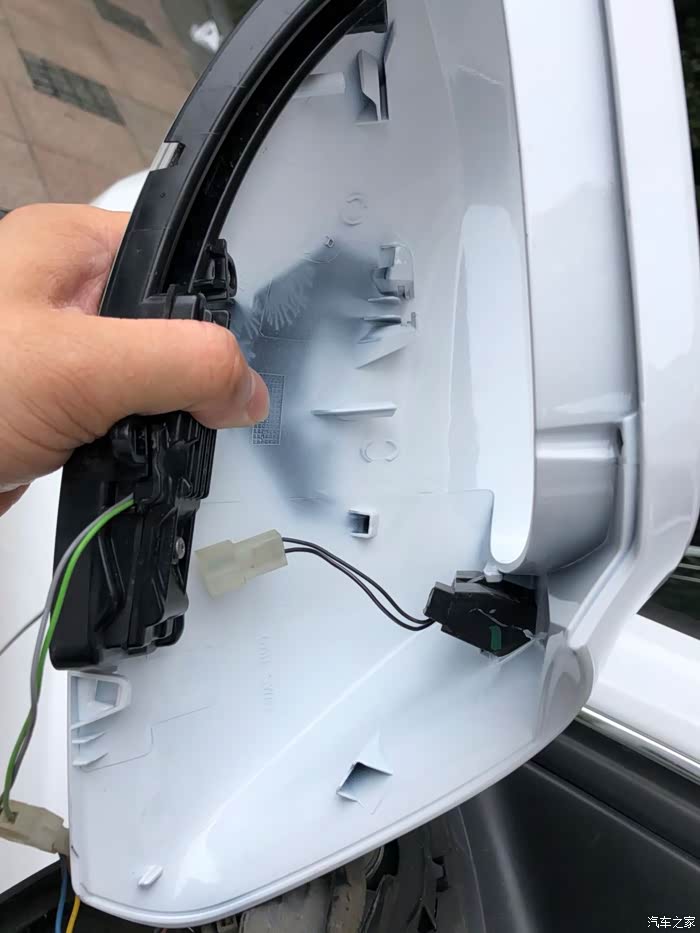 反向安装:1、接上转向灯模块和变道辅助模块的插头;2、把外壳往下推,保证所有卡子卡到位,与底座锁紧无间隙;3、把底座上的镜片加热的电源线接头套上镜片上凸起的两个片状端子,然后安装上镜片,确保镜片与底座卡紧。