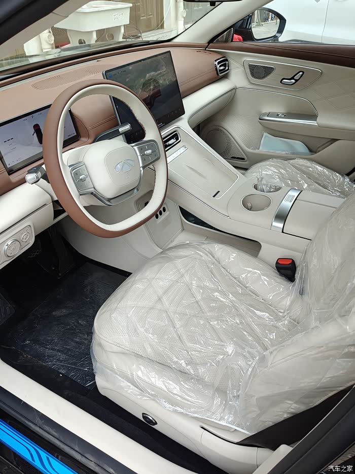 内饰:用料越级,智能化有提升空间,内饰是我最满意的点之一,大面积的翻毛皮和软质包裹,触手可及的地方基本没有硬塑料,米色的内饰缝线提升了精致感。双联屏(15.6英寸中控+12.3英寸仪表)分辨率高,车机搭载的骁龙8155芯片日常操作流畅,导航、听歌都不卡顿,但应用商店的软件资源偏少,没有主流的视频APP,这点比较遗憾。