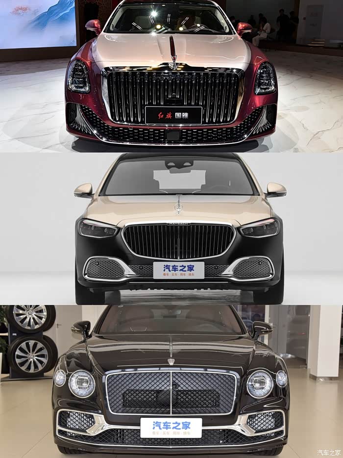 今天我们用红旗国雅与豪华车标杆奔驰S迈巴赫,还有超豪华车宾利飞驰做一个对比!国雅巨大的镀铬进气格栅,两侧竖起的异形大灯同样是有镀铬装饰,进气格栅的下边同样是用镀铬来装饰的,两侧的剑型装饰就像羽翼一样彰显大气。