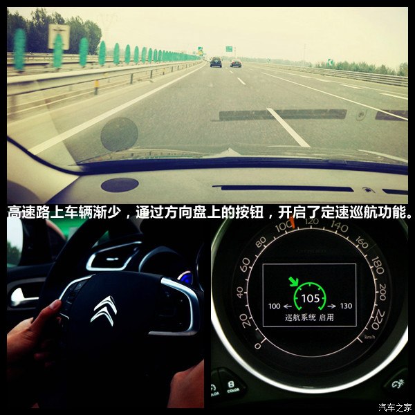 高速路上车辆渐少,通过方向盘上的按钮,开启了定速巡航功能。