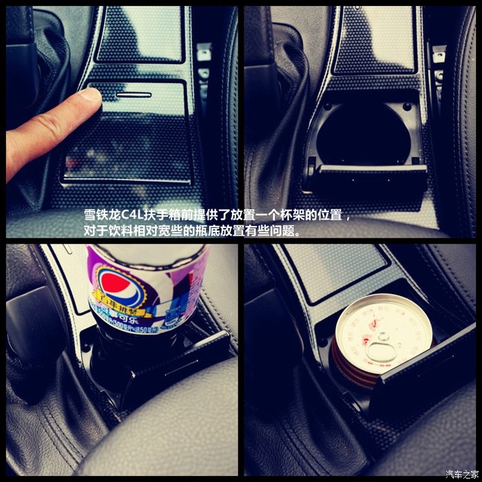 雪铁龙C4L扶手箱前提供了放置一个杯架的位置,对于饮料相对宽些的瓶底放置有些问题。