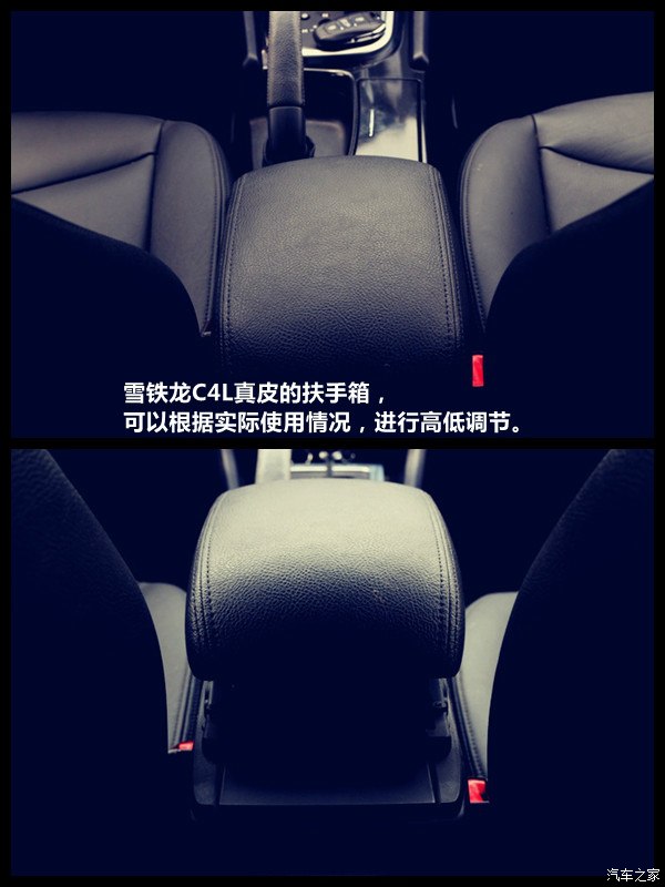 雪铁龙C4L真皮的扶手箱,可以根据实际使用情况,进行高低调节。