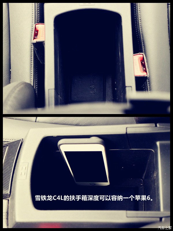 雪铁龙C4L的扶手箱深度可以容纳一个苹果6。