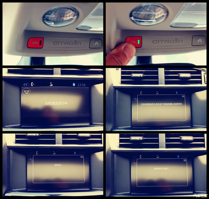 雪铁龙C4L配有远程SOS救援功能,按住车顶的红色SOS按钮10秒左右,车辆会自动连接雪铁龙SOS中心的工作人员。