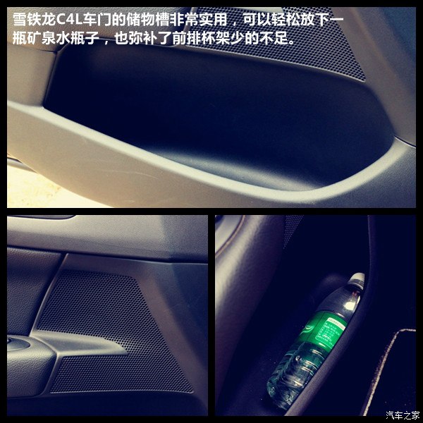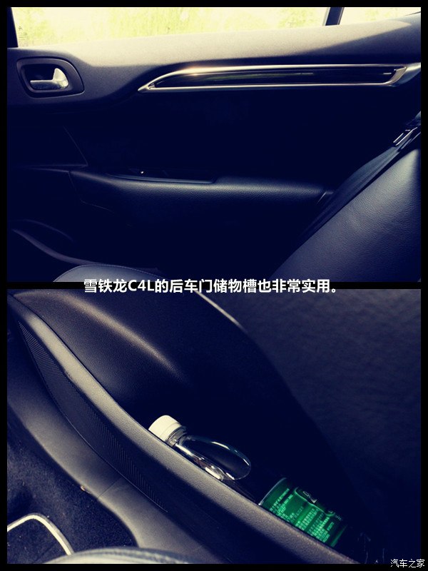 雪铁龙C4L车门的储物槽非常实用,可以轻松放下一瓶矿泉水瓶子,也弥补了前排杯架少的不足。