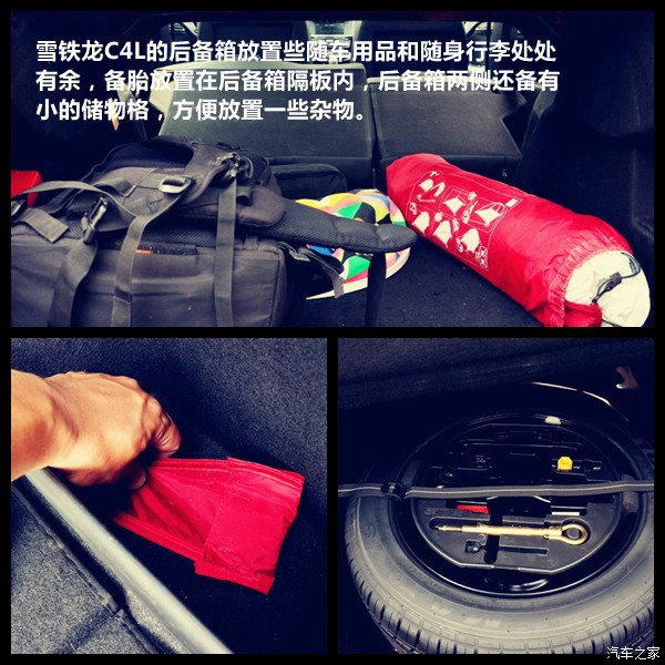 雪铁龙C4L的后备箱放置些随车用品和随身行李处处有余,备胎放置在后备箱隔板内,后备箱两侧还备有小的储物格,方便放置一些杂物。