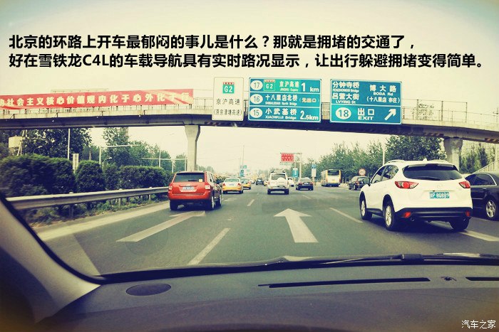 北京的环路上开车最郁闷的事儿是什么?那就是拥堵的交通了,好在雪铁龙C4L的车载导航具有实时路况显示,让出行躲避拥堵变得简单。