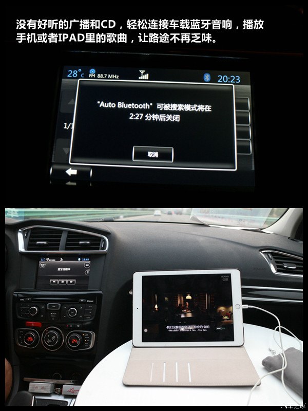 没有好听的广播和CD,轻松连接车载蓝牙音响,播放手机或者IPAD里的歌曲,让路途不再乏味。