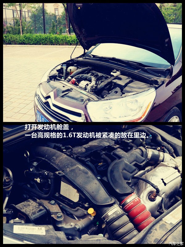 打开发动机舱盖,一台高规格的1.6T发动机被紧凑的放在里边。