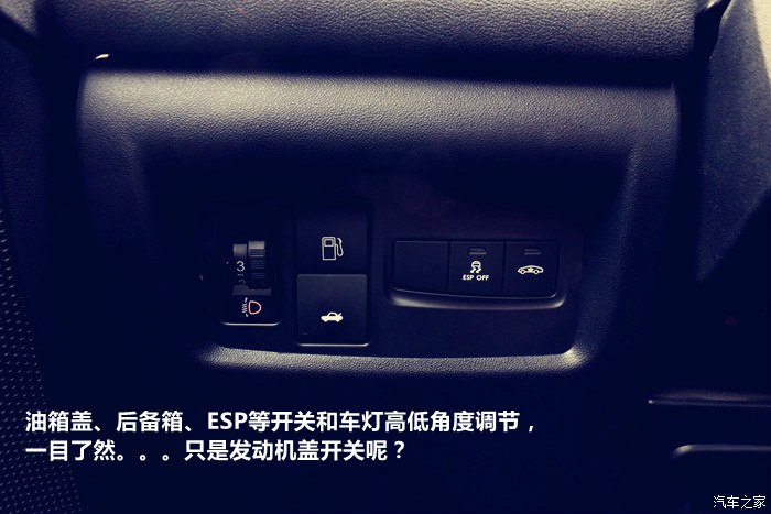 油箱盖、后备箱、ESP等开关和车灯高低角度调节,一目了然。。。只是发动机盖开关呢?