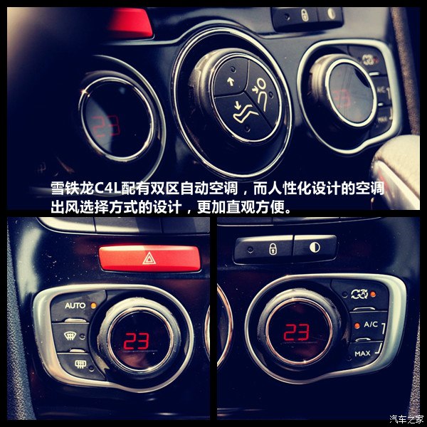 雪铁龙C4L配有双区自动空调,而人性化设计的空调出风选择方式的设计,更加直观方便。