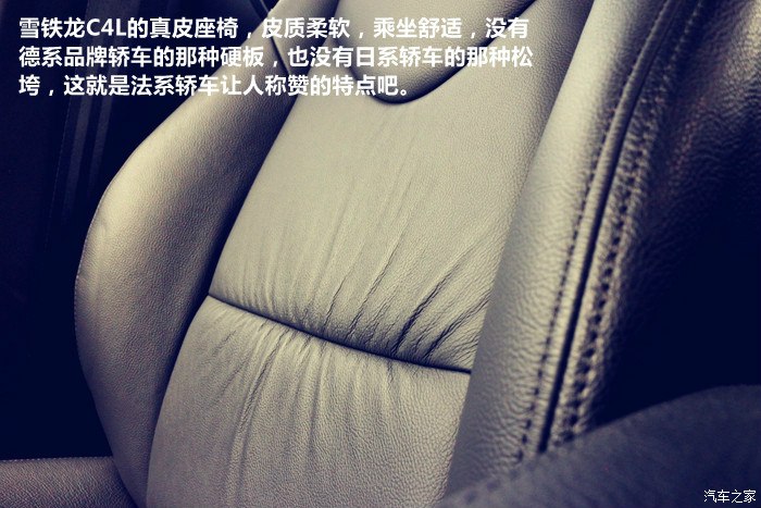雪铁龙C4L的真皮座椅,皮质柔软,乘坐舒适,没有德系品牌轿车的那种硬板,也没有日系轿车的那种松垮,这就是法系轿车让人称赞的特点吧。
