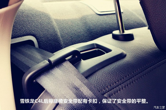 雪铁龙C4L后排座椅安全带配有卡扣,保证了安全带的平整。