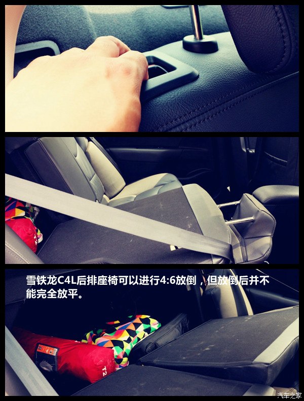 雪铁龙C4L后排座椅可以进行4:6放倒,但放倒后并不能完全放平。