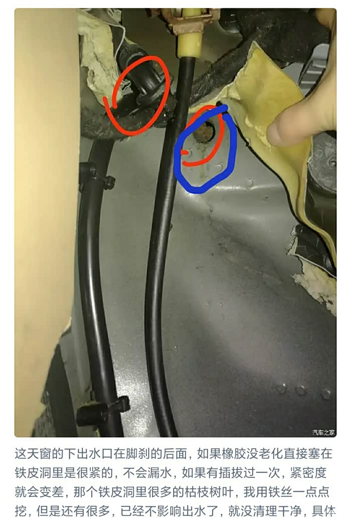 最简单的办法就是天窗上面排水口那倒点水,看前面哪里流水,顺着去找,一般是在前轮后面的挡泥板后,再就是前档排水沟里。