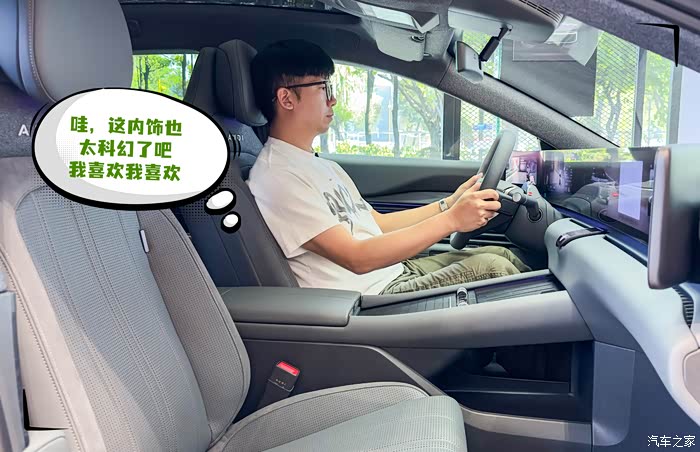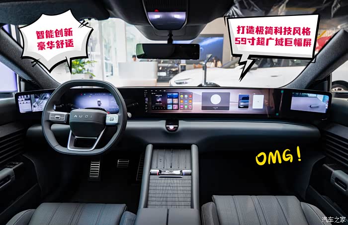 这套内饰即使看了几次,依然会觉得挺震撼的,59寸的超广域巨幅屏幕,涵盖车里所有的功能,几乎取消所有的实体按键,整体非常简洁有科技感,也很符合中国消费者审美需求